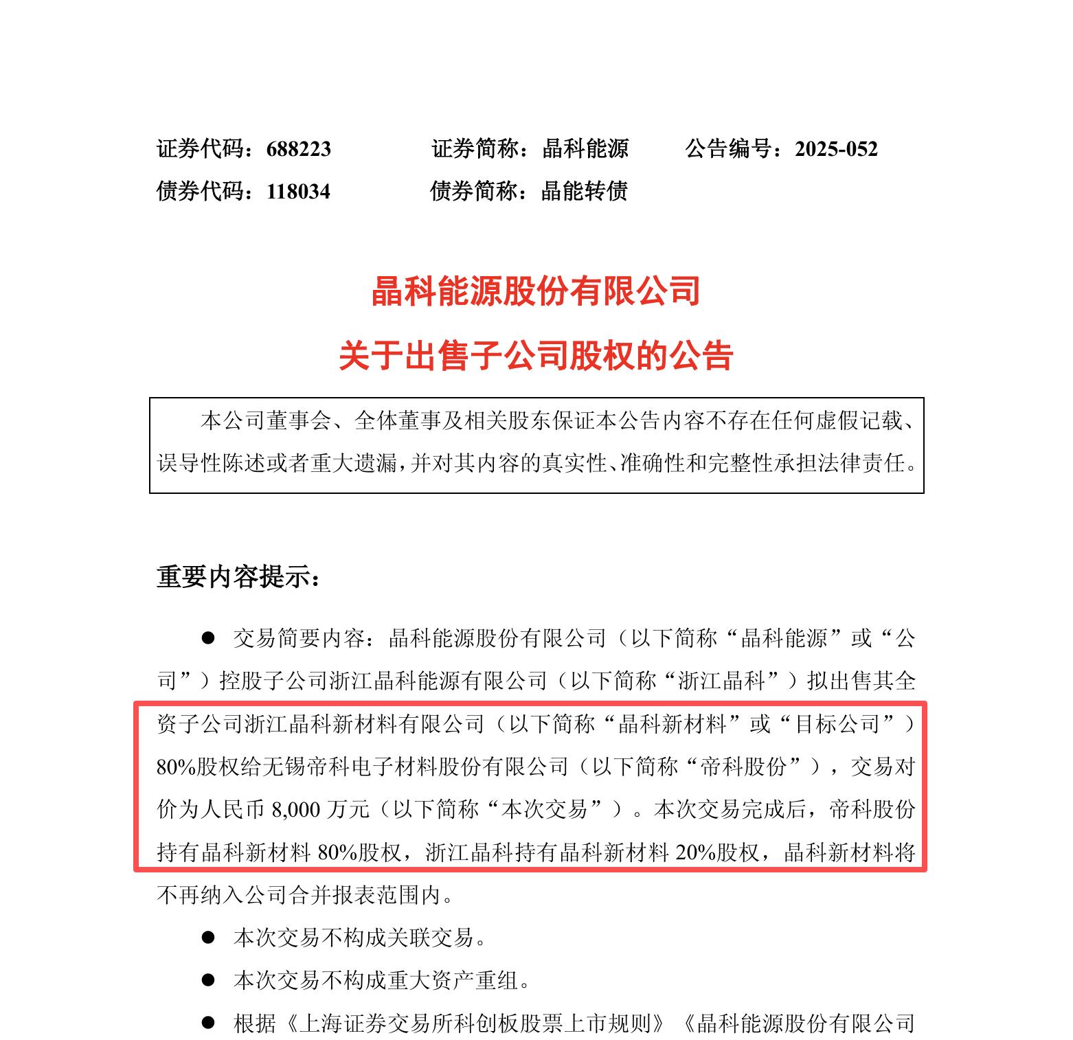 9月9日晚间,晶科能源(688223.SH)公布,为优化公司资产结构及资源配置,提高公司资产运营效率、降低管理成本,2025年9月8日,浙江晶科、晶科新材料与帝科股份签订《股权收购协议》,帝科股份拟以现金方式购买浙江晶科持有的全资子公司晶科新材料80%股权(以下简称“标的股权”)。根据双方共同确认的以2025年6月30日为评估基准日的评估结果,经各方协商一致,标的股权的交易对价确定为人民币8,000万元。本次交易完成后,帝科股份持有晶科新材料80%股权,浙江晶科持有晶科新材料20%股权,晶科新材料将不再纳入公司合并报表范围内。