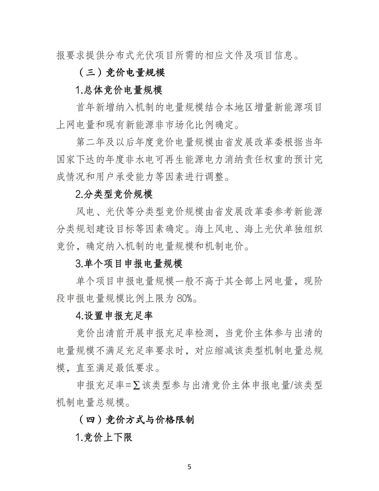 文件表示,风电、光伏等分类型竞价规模由省发展改革委参考新能源分类规划建设目标等因素确定。海上风电、海上光伏单独组织竞价,确定纳入机制的电量规模和机制电价。