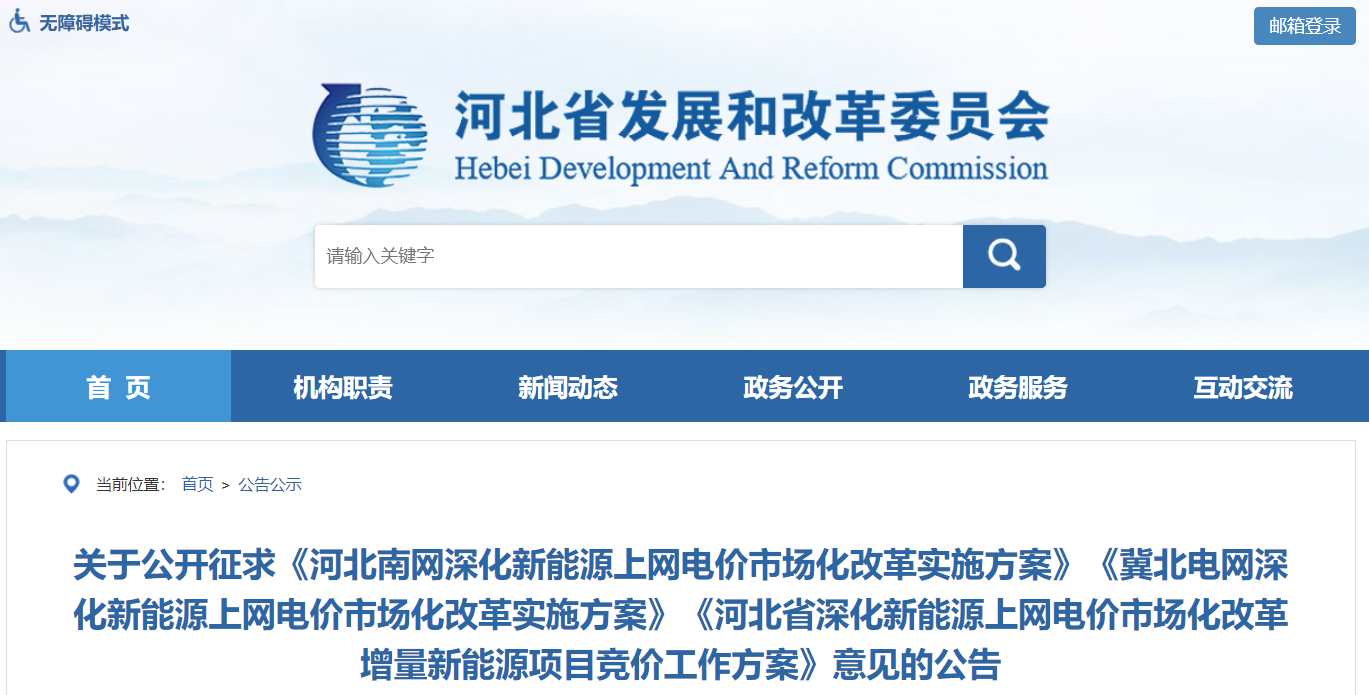 关于公开征求《河北南网深化新能源上网电价市场化改革实施方案》《冀北电网深化新能源上网电价市场化改革实施方案》《河北省深化新能源上网电价市场化改革增量新能源项目竞价工作方案》意见的公告