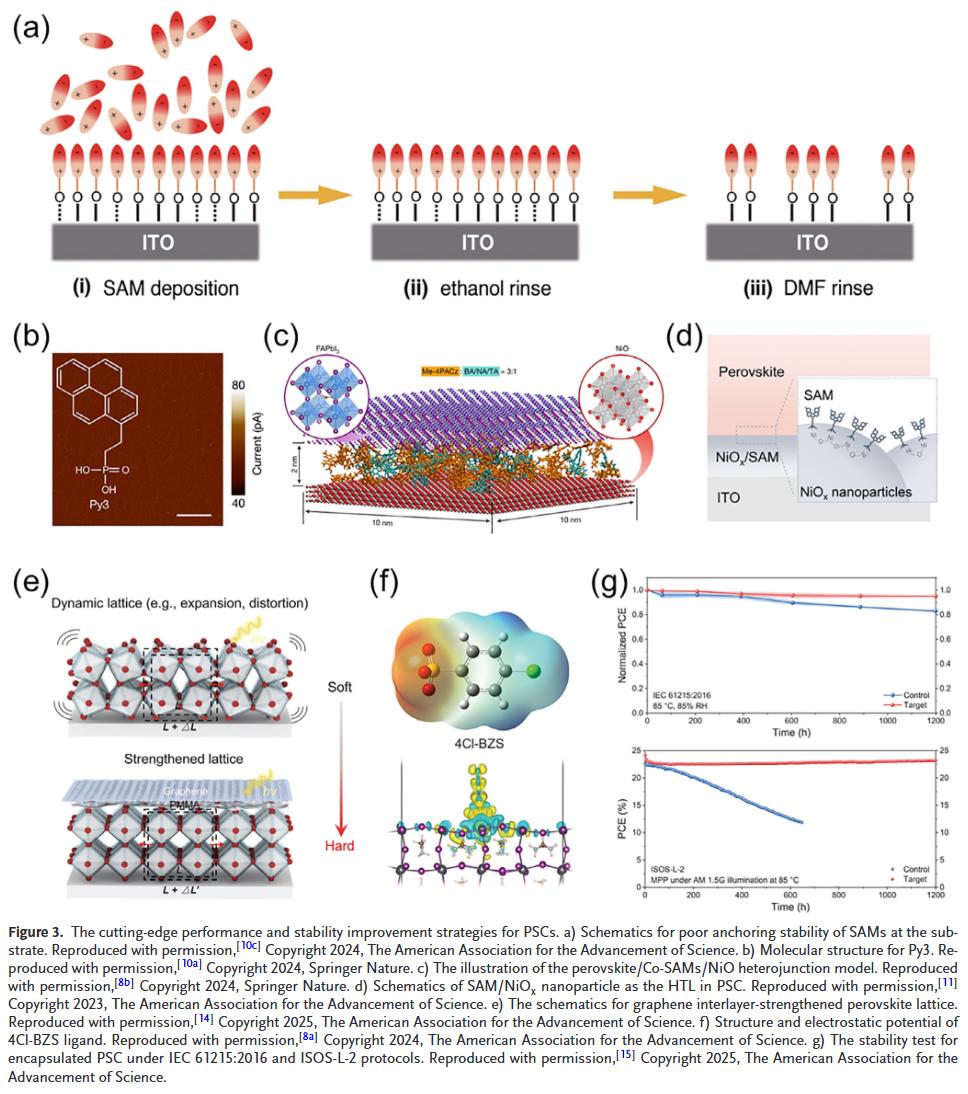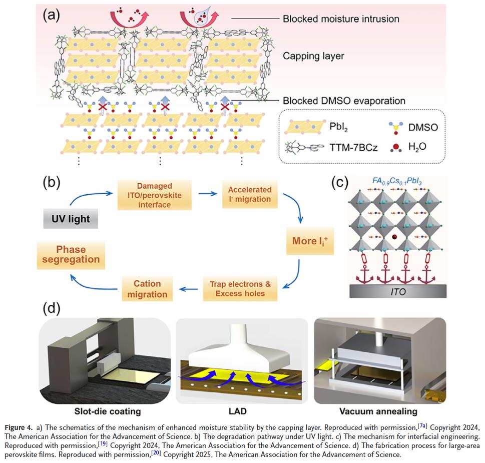 重点介绍了自组装单分子层(SAMs)、界面工程、晶相稳定化、大面积模组制备等最新技术进展,尤其是在提高器件效率和环境稳定性方面的突破性策略。