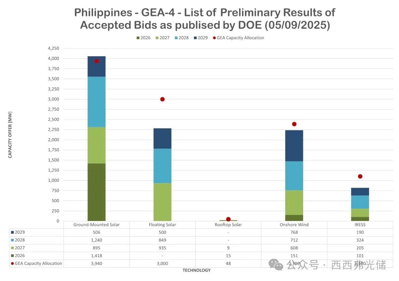 GEA-4旨在通过新增9,378兆瓦的地面光伏、屋顶光伏、漂浮式光伏和陆上风电项目,加速该国的可再生能源转型。值得注意的是,本轮拍卖标志着一个里程碑,因为这是首次将可再生能源与储能系统(IRESS)——特别是与电池储能系统(BESS)配套的光伏电站——整合到拍卖中。通过新增1,100兆瓦配备储能的光伏容量,这些项目有望在支持国家日益增长的电力需求的同时,提升电网的可靠性和灵活性。