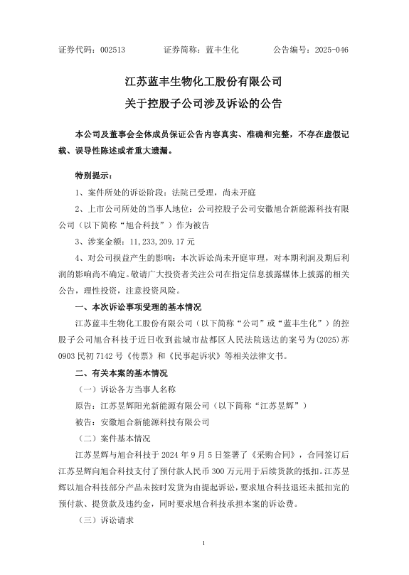 9 月 9 日,蓝丰生化(002513)发布公告称,公司控股子公司旭合科技近日收到盐城市盐都区人民法院送达的《传票》和《民事起诉状》等法律文书。