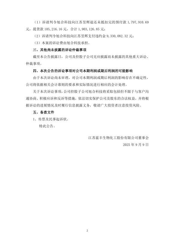 蓝丰生化在公告中表示,截至披露日,公司及控股子公司无其他应披露而未披露的重大诉讼、仲裁事项。由于本次诉讼尚未审理,对公司本期利润或期后利润的影响存在不确定性,旭合科技将采取沟通协商、积极应诉和反诉等措施维护公司及股东合法权益,并及时履行信息披露义务。