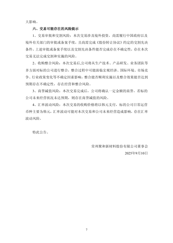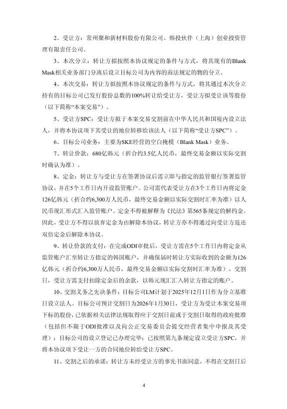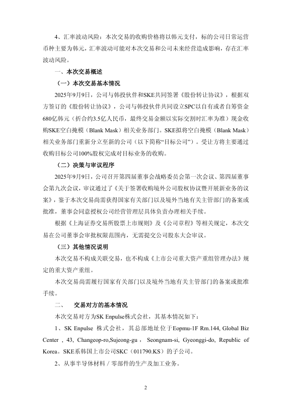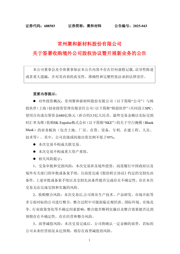 9 月 10 日,聚和材料发布公告称,于 9 月 9 日,公司与韩投伙伴共同签署协议,将以 680 亿韩元(折合约 3.5 亿人民币)现金收购韩国 SKE 公司的空白掩模(Blank Mask)相关业务部门。据悉,SKE 拟将该业务部门重新分立至新公司,聚和材料方面将主要通过收购目标公司 100% 股权完成对目标业务的收购,其直接或间接出资比例不低于 95%。