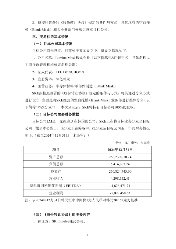 此次被收购方 SKE 公司,是韩国半导体材料零部件设备整体解决方案供应商。其旗下 Blank Mask 事业部生产的用于 DUV - ArF 和 DUV - KrF 光刻技术节点的空白掩模基板,已通过多家半导体晶圆厂及第三方独立掩模板客户验证,并实现量产销售,业务覆盖韩国、中国大陆及中国台湾等国家和地区。