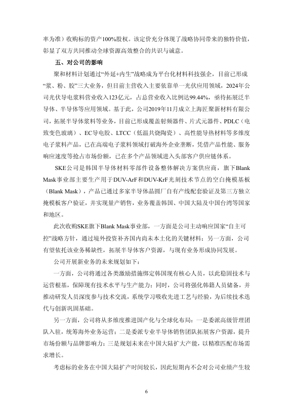 聚和材料表示,此次收购一方面是响应国家 “自主可控” 战略方针,补齐国内尚未本土化的关键材料;另一方面,公司希望依托该业务的稀缺性,拓展半导体客户资源,与现有业务协同发展。