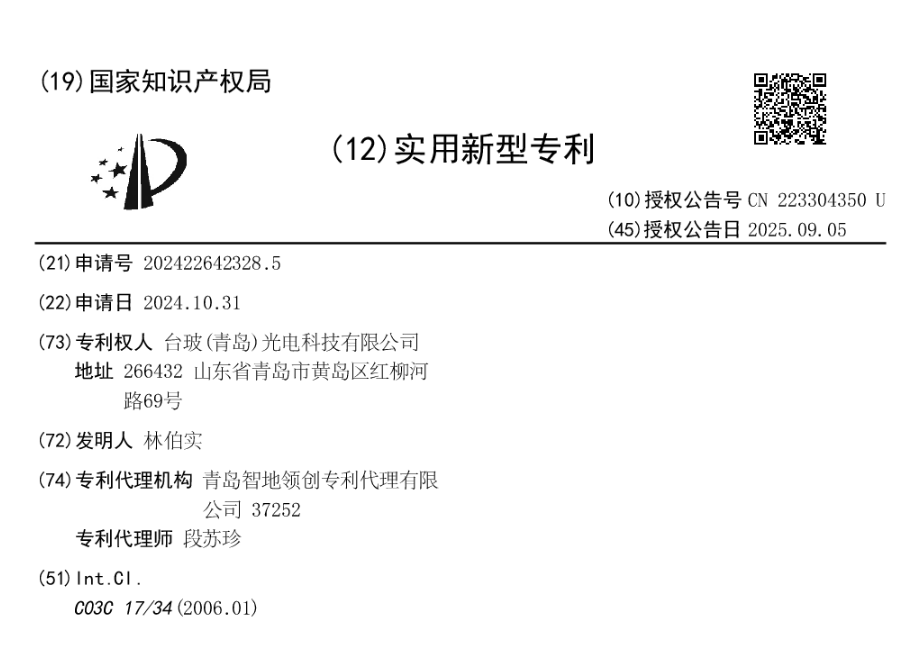 据国家知识产权局发布信息显示,台玻(青岛)光电科技有限公司申请的一项名为高透低阻的导电玻璃的发明专利于2025年9月5日公开。专利申请号:2024226423285;专利公布号:CN223304350U.