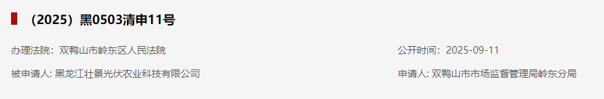 据全国企业破产重整案件信息网9月11日披露,黑龙江壮景光伏农业科技有限公司被申请破产,申请人双鸭山市市场监督管理局岭东分局。