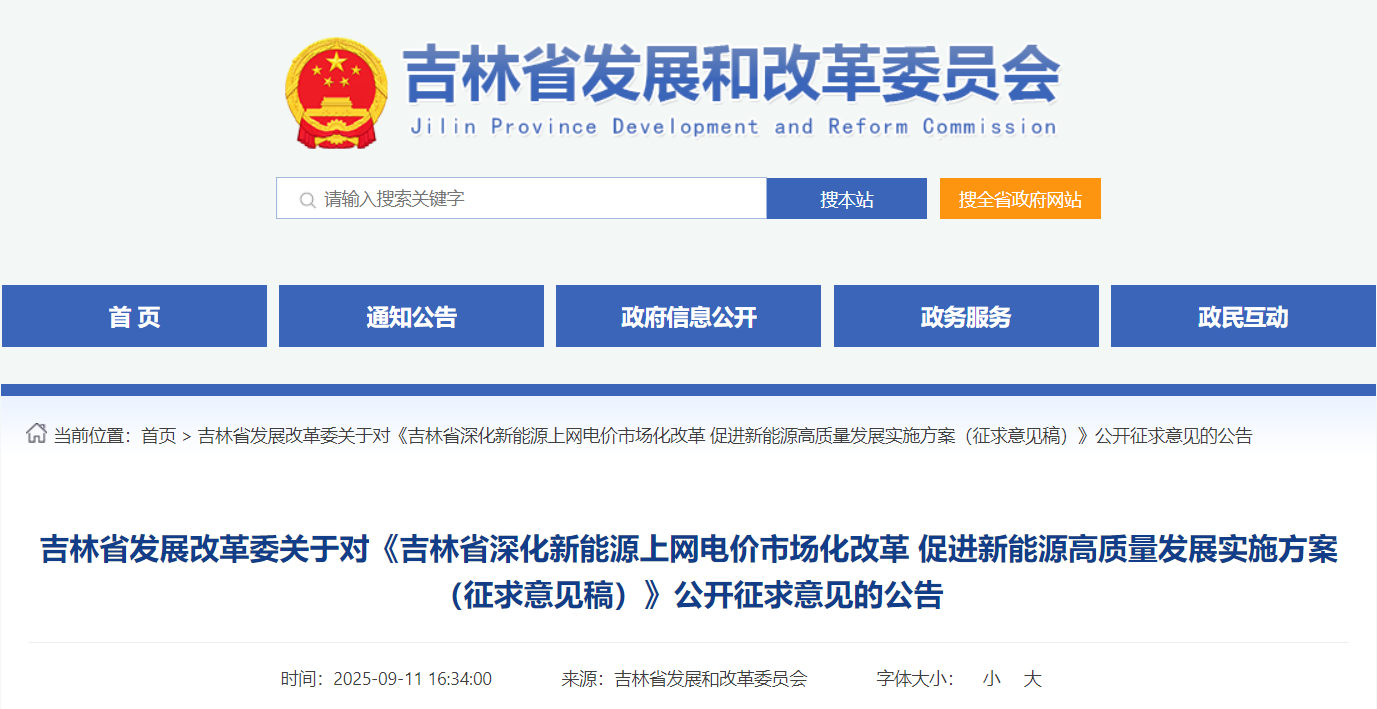 9月11日,吉林发改委印发关于对《吉林省深化新能源上网电价市场化改革 促进新能源高质量发展实施方案(征求意见稿)》公开征求意见的公告。