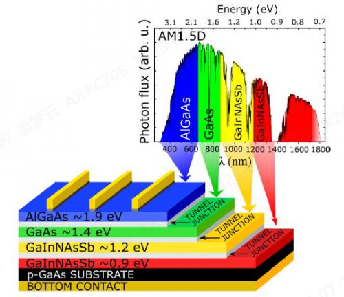 图 1. 具有 1.9 eV、1.4 eV、1.2 eV 和 0.9 eV 结的 4J 叠层电池的示意图结构。1.2eV 和 0.9eV pn 结基于 GalnNAsSb [ 5 ] 。