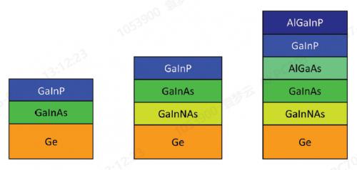 图 2. 由 III-V 半导体材料制成的不同多结太阳电池的示例草图 [ 1 ]