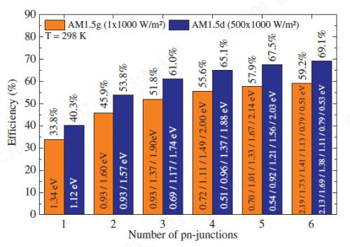 图 3. 在 AM1.5g(1×1000W/m2)和 500 倍聚光 AM1.5d(500×1000W/m2)条件下不同 pn 结(子电池)数量的理论效率极限 [ 1 ]