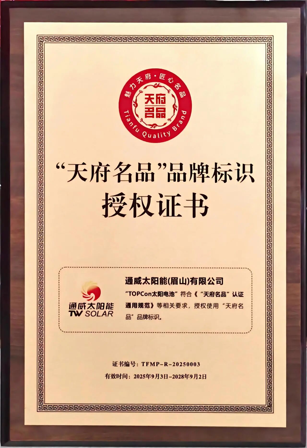 9月10日,通威太阳能(眉山)有限公司TOPCon电池产品成功荣获“天府名品”品牌荣誉称号,并获授牌。眉山公司凭借卓越的标准化体系建设能力和显著的品牌影响力,在评选中脱颖而出,成为四川光伏行业首家获评企业。