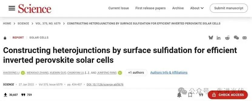 Li, X., Zhang, W., Guo, X., et al. Constructing heterojunctions by surface sulfidation for efficient inverted perovskite solar cells. Science (2022).https://doi.org/10.1126/science.abl5676