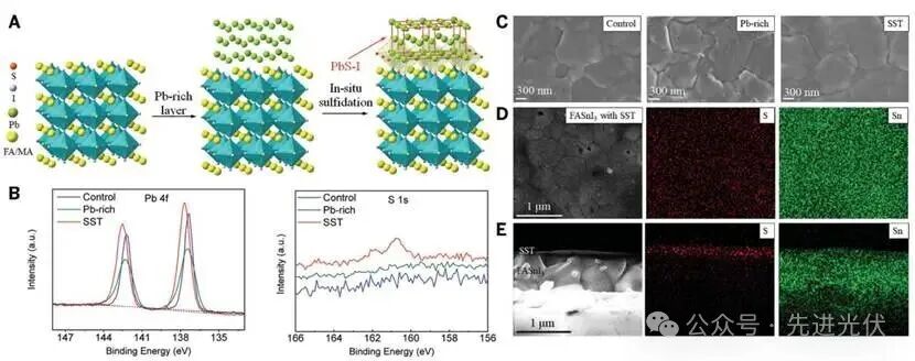 图1A展示了表面硫化处理(SST)方法的构建过程:首先通过旋涂吡啶-2-羧酸铅(PbPyA₂)在钙钛矿表面形成富铅层,随后利用六甲基二硅烷(TMS)进行硫化反应,XPS谱图(图1B)证实了硫化后硫元素(S 1s)在162.0和160.8 eV处的特征峰出现,同时铅(Pb 4f)结合能发生0.3 eV的位移,表明强Pb-S键的形成。SEM图像(图1C)显示原始钙钛矿具有均匀晶粒结构,而富铅处理后出现亮斑(PbPyA₂导电性差所致),经TMS处理后亮斑消失并生成新的硫化产物,进一步通过Sn基钙钛矿的SEM-EDX映射验证了硫元素与铅元素的共定位,说明硫化反应成功发生于富铅区域。