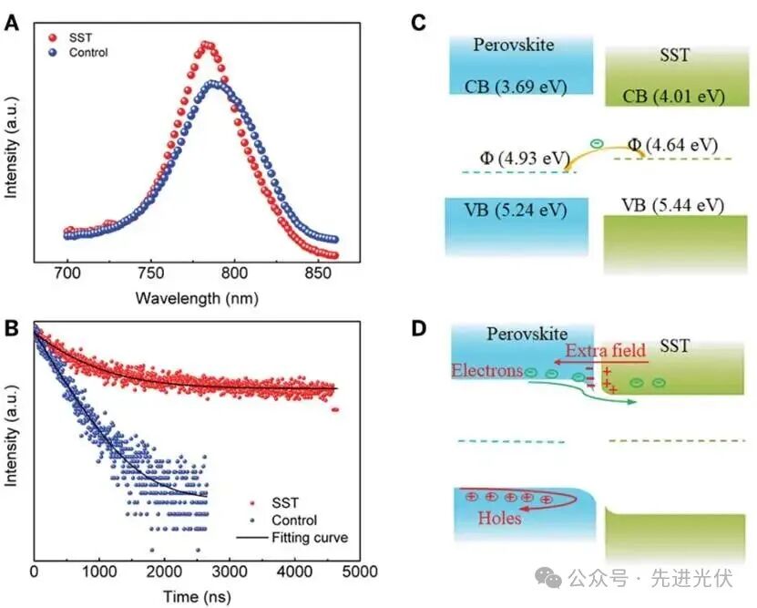 Pb-S 键异质结构建:通过 TMS 与富铅钙钛矿反应形成强 Pb-S 键,既上移界面费米能级(使表面呈弱 n 型),又诱导额外背表面场,与内建电势协同提升电子提取效率,抑制空穴传输损失。