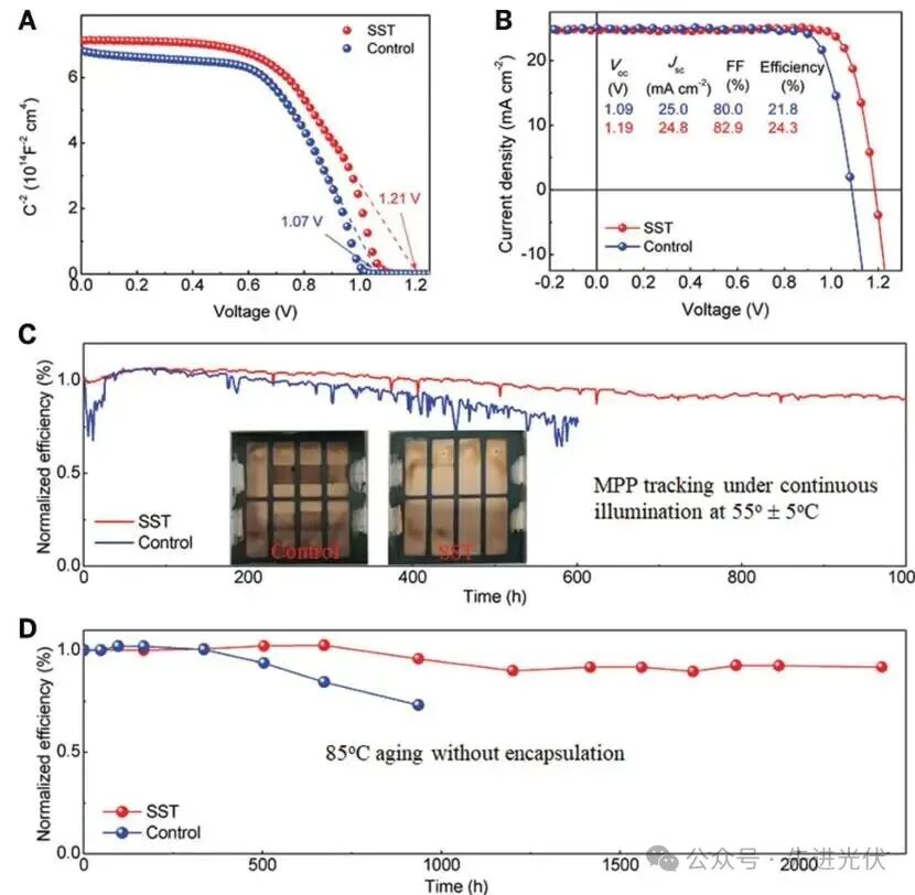 图3A的Mott-Schottky曲线显示SST器件内建电势(Vbi)从1.07 V提高至1.21 V,与J-V曲线(图3B)中1.19 V的高开路电压(Voc)相符;器件效率从21.8%提升至24.3%,填充因子(FF)从80.0%增至82.9%,且认证效率达23.5%;稳定性测试(图3C-D)表明SST器件在55°C连续光照下MPP跟踪1000小时后仍保持90.5%初始效率,85°C热老化2200小时后保留91.8%效率,而对照组器件分别仅剩77.6%和73.2%,且铜电极出现明显黑化降解(插图),证明硫化处理显著抑制了工作与热应力下的性能衰减。