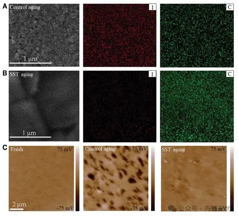 图4通过SEM-EDX和KPFM分析了MPP跟踪后器件的界面降解与离子迁移:对照组器件移除电极后PCBM层出现强烈碘信号(图4A),钙钛矿形貌消失且表面电势波动剧烈(图4C暗区),表明碘离子扩散导致界面腐蚀与电极降解;而SST器件PCBM层碘信号微弱(图4B),钙钛矿晶粒清晰可见,表面电势与新鲜器件一致(图4C),证明强Pb-S键有效稳定了钙钛矿异质结,抑制了离子迁移并保护了PCBM层,从而大幅提升器件运行稳定性。