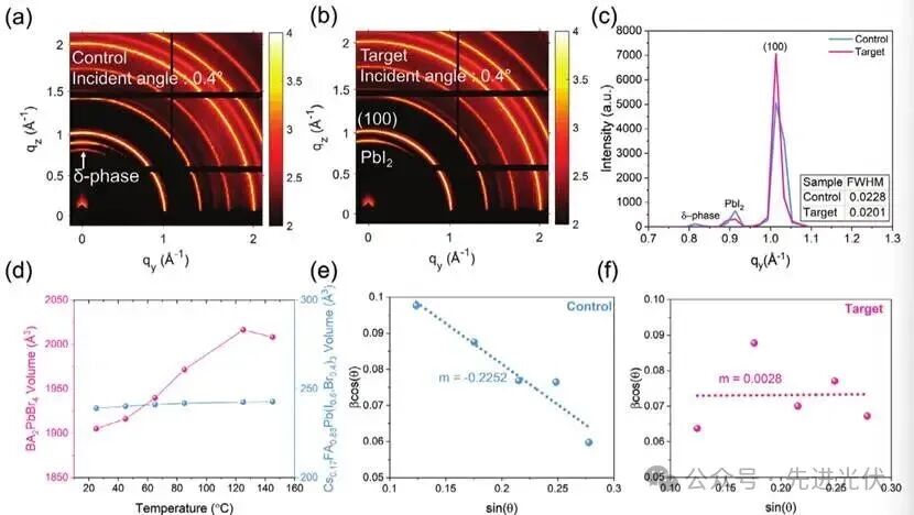 图2通过GIWAXS和XRD分析揭示了二维层对三维钙钛矿结晶质量的提升作用:GIWAXS显示目标样品(含BA₂PbBr₄)的(100)晶面衍射强度更高且半峰宽更窄,同时δ相和PbI₂杂相减少,表明结晶度改善;热膨胀系数测量发现二维层(5.18×10⁻⁴ °C⁻¹)能缓冲SnO₂(3.23×10⁻⁶ °C⁻¹)与三维钙钛矿(1.24×10⁻⁴ °C⁻¹)之间的热失配,Williamson-Hall曲线进一步证明目标样品的晶格应变得到抑制,说明二维层促进了更均匀且低应变的晶体生长。