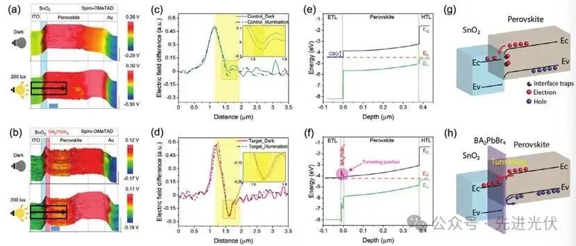 图3结合截面KPFM和TCAD模拟阐明了二维层的隧穿效应:KPFM显示目标器件在SnO₂/钙钛矿界面处接触电势差变化更陡峭(斜率-0.244 vs -0.041),光照下电场分布几乎无变化,表明载流子无积累且传输高效;TCAD能带模拟表明二维层在SnO₂与钙钛矿间形成窄势垒(约9 nm),虽导带偏移较大但通过强能带弯曲实现电子隧穿,而对照组因0.5 eV的cliff 型偏移导致界面电荷陷阱和复合损失。