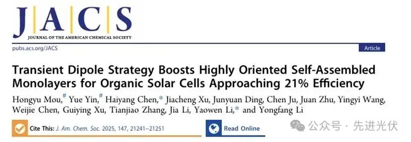 Mou, H., Yin, Y., Chen, H., et al. Transient Dipole Strategy Boosts Highly Oriented Self-Assembled Monolayers for Organic Solar Cells Approaching 21% Efficiency.J. Am. Chem. Soc.2025,147, 21241–21251.