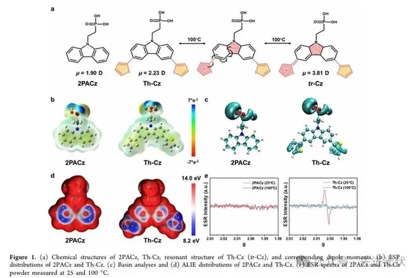 1.瞬态共振结构:Th-Cz在100°C退火下形成tr-Cz,偶极矩提升至3.81 D,促进有序自组装。