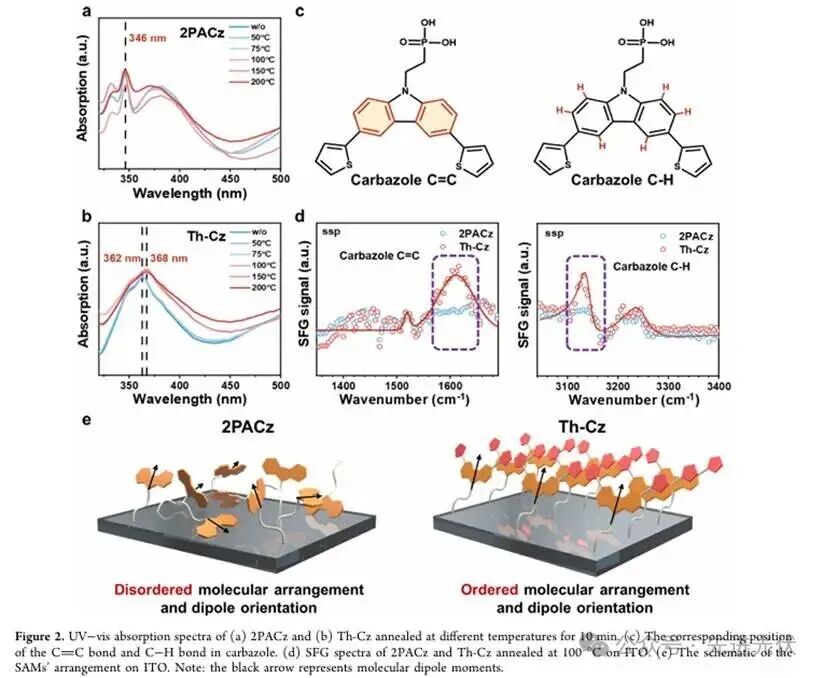 2.高度取向偶极:SFG光谱显示Th-Cz薄膜具有垂直于基底的偶极取向,增强界面极化与空穴提取。