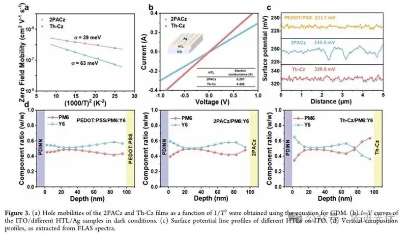 该图展示了不同空穴传输层的电学性能和活性层的垂直相分离特性。图3a的载流子迁移率分析表明Th-Cz薄膜的能量无序参数(σ)从2PACz的63 meV降至39 meV,说明分子有序性提高。图3b的I-V曲线显示Th-Cz的导电性优于2PACz。图3c的表面电位测试和UPS测量(图S9)证实Th-Cz具有更高功函数(5.28 eV)。图3d的薄膜深度依赖光吸收谱(FLAS)显示Th-Cz基活性层底部给体(PM6)含量达63.5%,形成了给体富集的垂直相分离结构,这有利于平衡载流子迁移率。