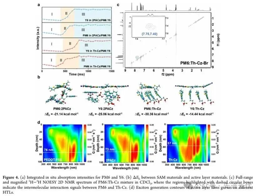 该图揭示了Th-Cz调控活性层结晶动力学和激子生成的机制。图4a的原位紫外吸收表明Th-Cz基活性层中PM6先于Y6结晶,形成给体富集的底部相。图4b的结合能计算和图4c的二维核磁共振谱证实Th-Cz与PM6之间存在强范德华相互作用(-30.36 kcal/mol),而Th-Cz与Y6相互作用较弱(-14.44 kcal/mol)。图4d的激子生成轮廓显示Th-Cz基活性层的最大激子生成区位于膜中层(57 nm深度),不同于PEDOT:PSS和2PACz基器件的底部生成(73-76 nm),这种分布有利于平衡电荷传输。