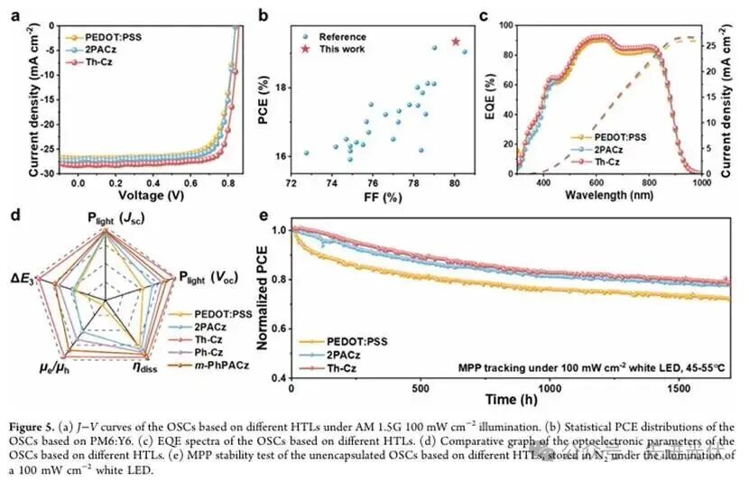 该图系统比较了不同空穴传输层有机太阳能电池的性能和稳定性。图5a的J-V曲线显示Th-Cz基器件效率,优于PEDOT:PSS和2PACz。图5b的统计分布和图5c的外量子效率(EQE)谱验证了结果的可靠性。图5d的雷达图表明Th-Cz器件在开路电压(0.86 V)、填充因子(80.42%)和非辐射能量损失等方面具有优势。图5e的最大功率点跟踪测试显示Th-Cz器件在1500小时光照后仍保持80%初始效率,展现了优异的操作稳定性。