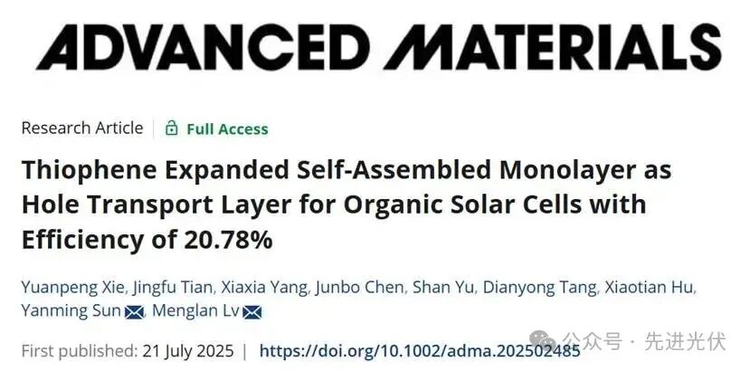 Y. Xie, J. Tian, X. Yang, J. Chen, S. Yu, D. Tang, X. Hu, Y. Sun, M. Lv, “Thiophene Expanded Self‐Assembled Monolayer as Hole Transport Layer for Organic Solar Cells with Efficiency of 20.78%”,Adv. Mater.2025, e02485.
