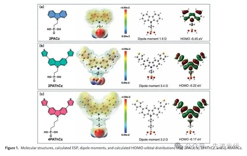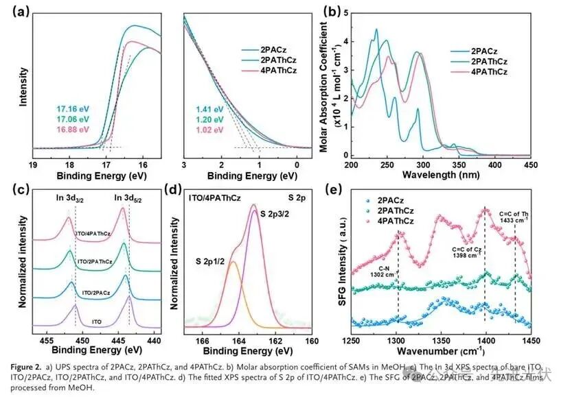2.间隔基团长度调控溶解性与有序性:4PAThCz凭借更长烷基链实现优异溶解性,抑制自聚集,形成高度有序的SAM结构,增强界面覆盖与缺陷钝化。