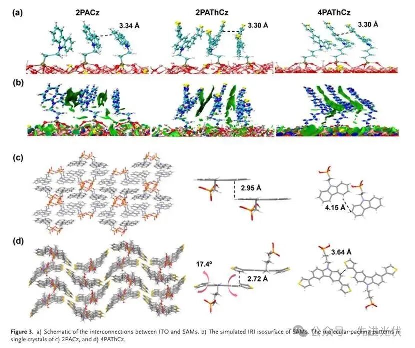 通过单晶分析和理论计算揭示了SAMs的堆积行为。2PACz呈现高对称性平行堆积(π-π距离2.95 Å),而4PATHCz因噻吩扭曲(二面角17.4°)形成更紧密的斜向堆积(π-π距离2.72 Å)。IRI分析显示4PATHCz分子间存在强范德华作用和适度位阻,这种平衡作用使其既能保持溶解性又具备有序组装能力。
