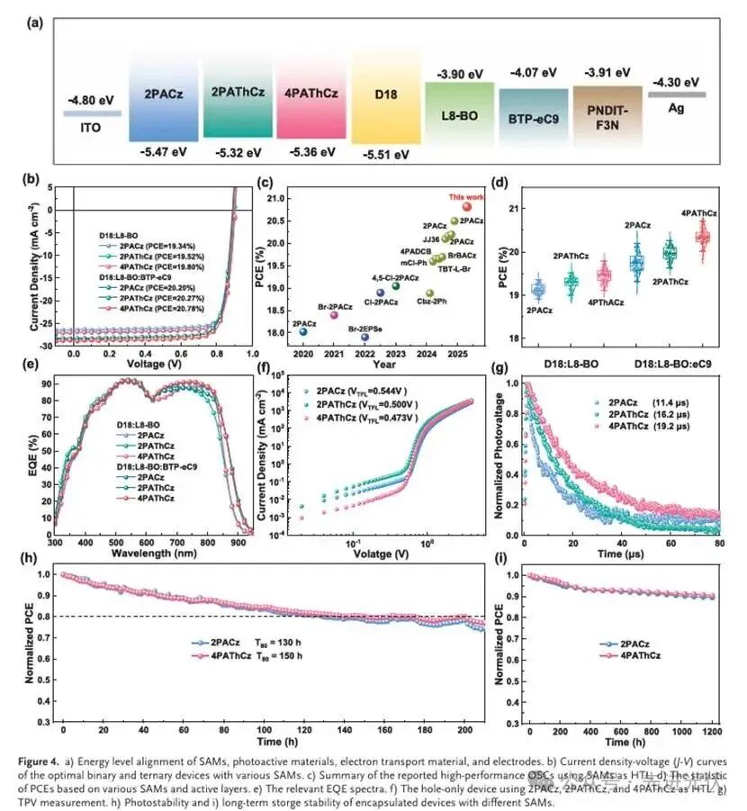 3.能级匹配与界面优化:SAMs的HOMO能级(-5.32至-5.36 eV)与给体材料D18良好匹配,促进空穴提取并阻挡电子反向传输,提升器件开路电压与填充因子。