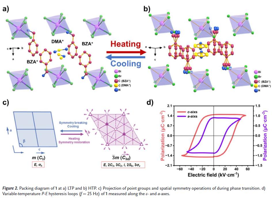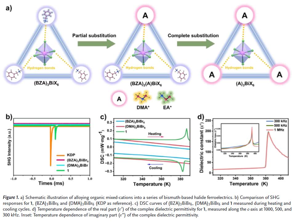本文中国科学院大学刘毅和孙志华等人通过将有机混合阳离子合金化引入铋基原型结构中,设计出一系列具有强光热释电效应的新型多轴铁电体,其中以(BZA)₂(DMA)BiBr₆(1,BZA为苄铵,DMA为二甲铵)最为典型。小尺寸DMA⁺阳离子的动态运动提供了打破3mFm对称性的驱动力,从而赋予其6个等效极化方向的多轴铁电性。