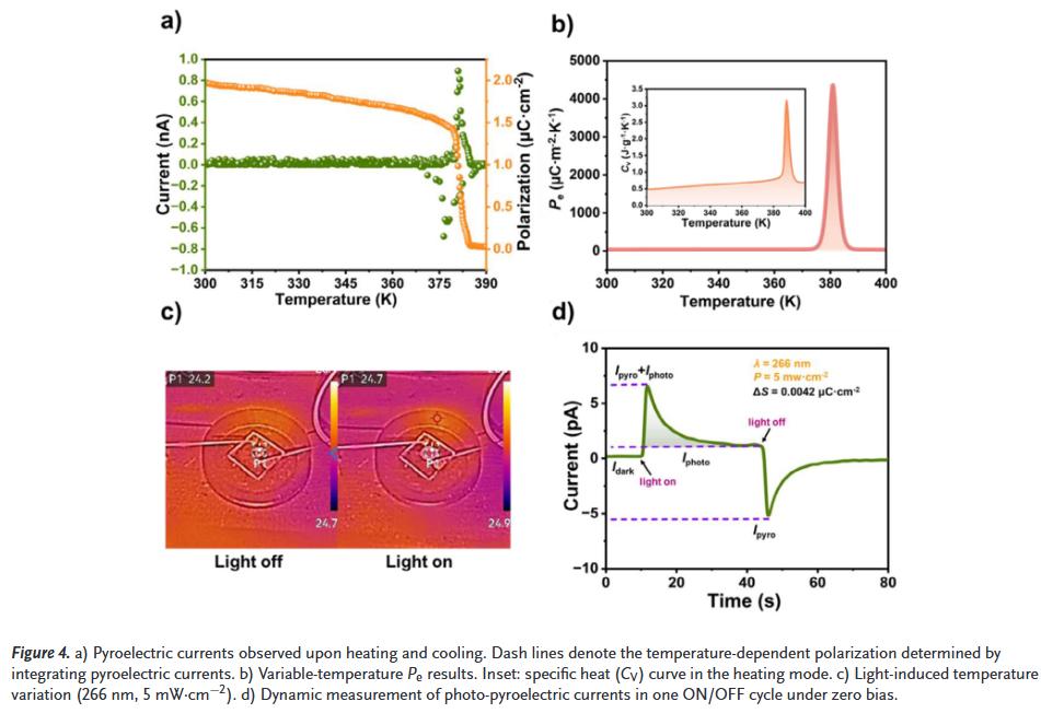 值得注意的是,1在宽紫外至近红外光谱范围(266–980 nm)内表现出光热释电效应,并与铁电体体光伏效应耦合,产生高达~4800%的光电流增强比,远超已知铁电材料。该研究为设计新型光活性铁电材料用于智能光电器件提供了新思路。