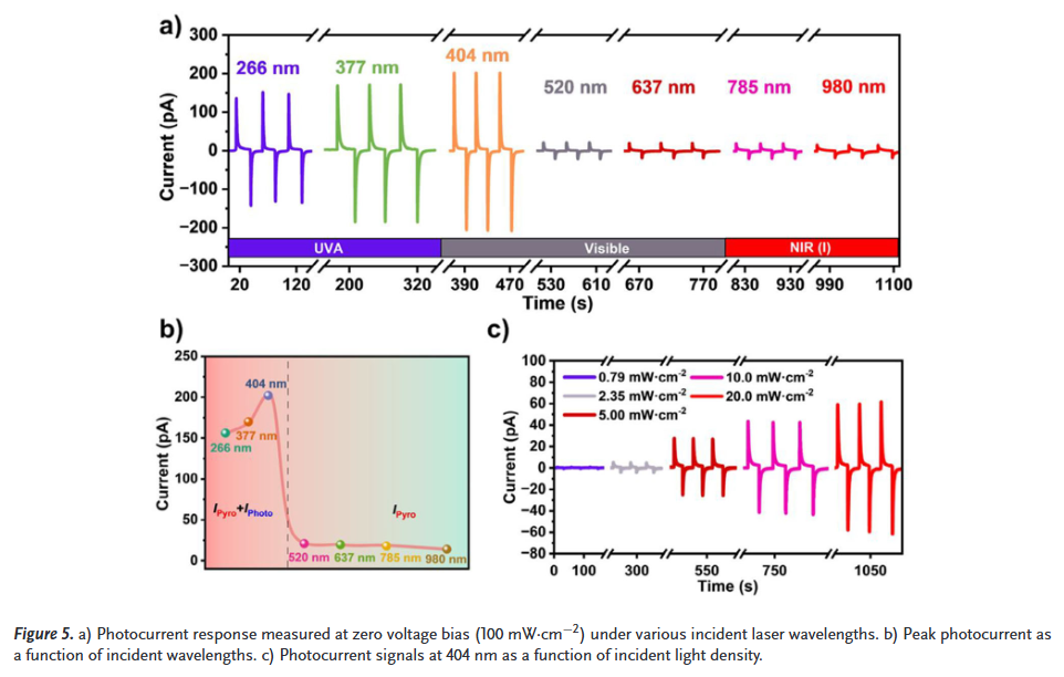 - 宽谱光热释电响应:材料在266–980 nm紫外-近红外范围内均表现出显著的光热释电效应,突破带隙限制,实现超宽带光电探测。