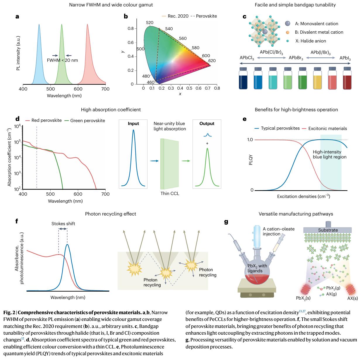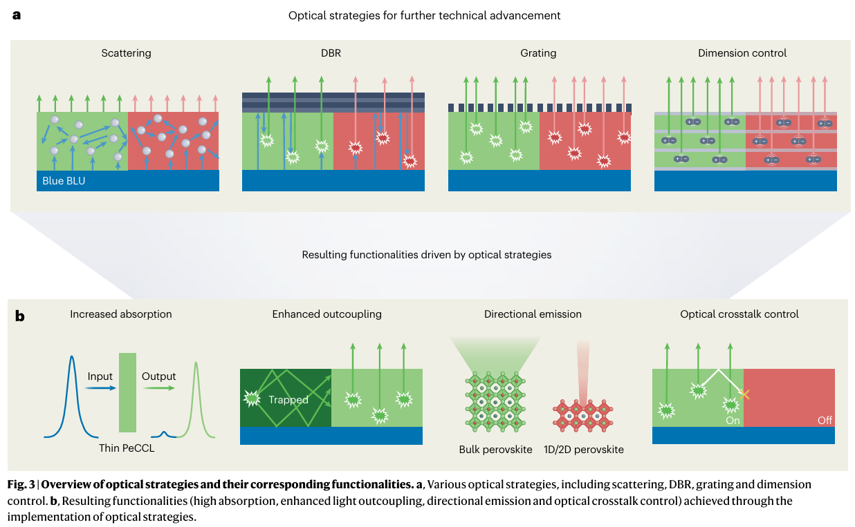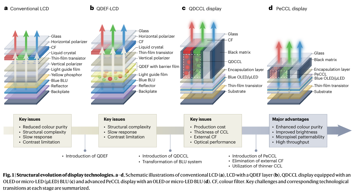 - 钙钛矿色彩转换层(PeCCL)的独特优势:相比量子点(QD),钙钛矿具有更窄的半高宽(FWHM < 20 nm)、更高的吸收系数(10⁴–10⁵ cm⁻¹),可实现更薄的CCL(<2 μm),无需外置彩色滤光片,显著提升色彩纯度和分辨率。