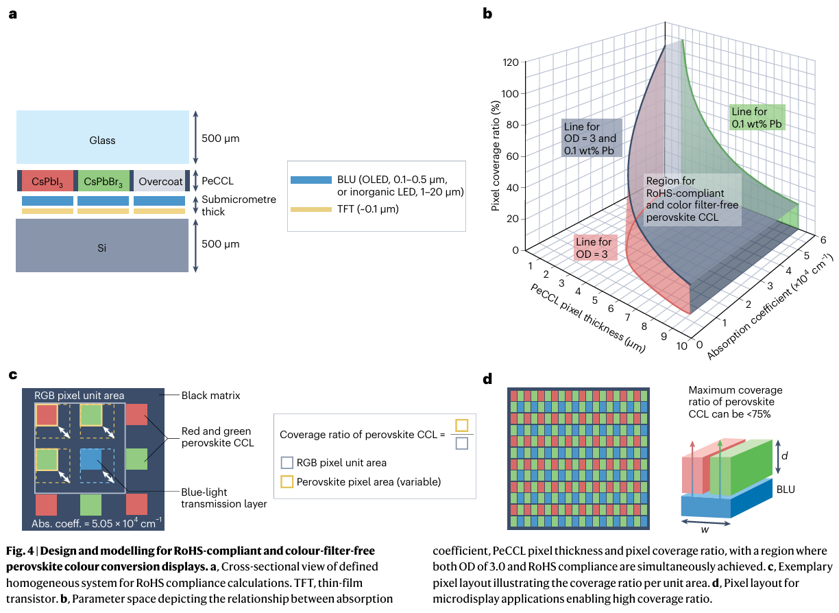 - RoHS合规性与商业化路径:通过建模分析,证明即使使用铅基钙钛矿,在合理厚度(<2 μm)和像素覆盖率(<75%)下仍可满足RoHS铅含量限制(1000 ppm),同时提出无铅钙钛矿开发、铅泄漏管理和回收策略,为可持续发展铺路。