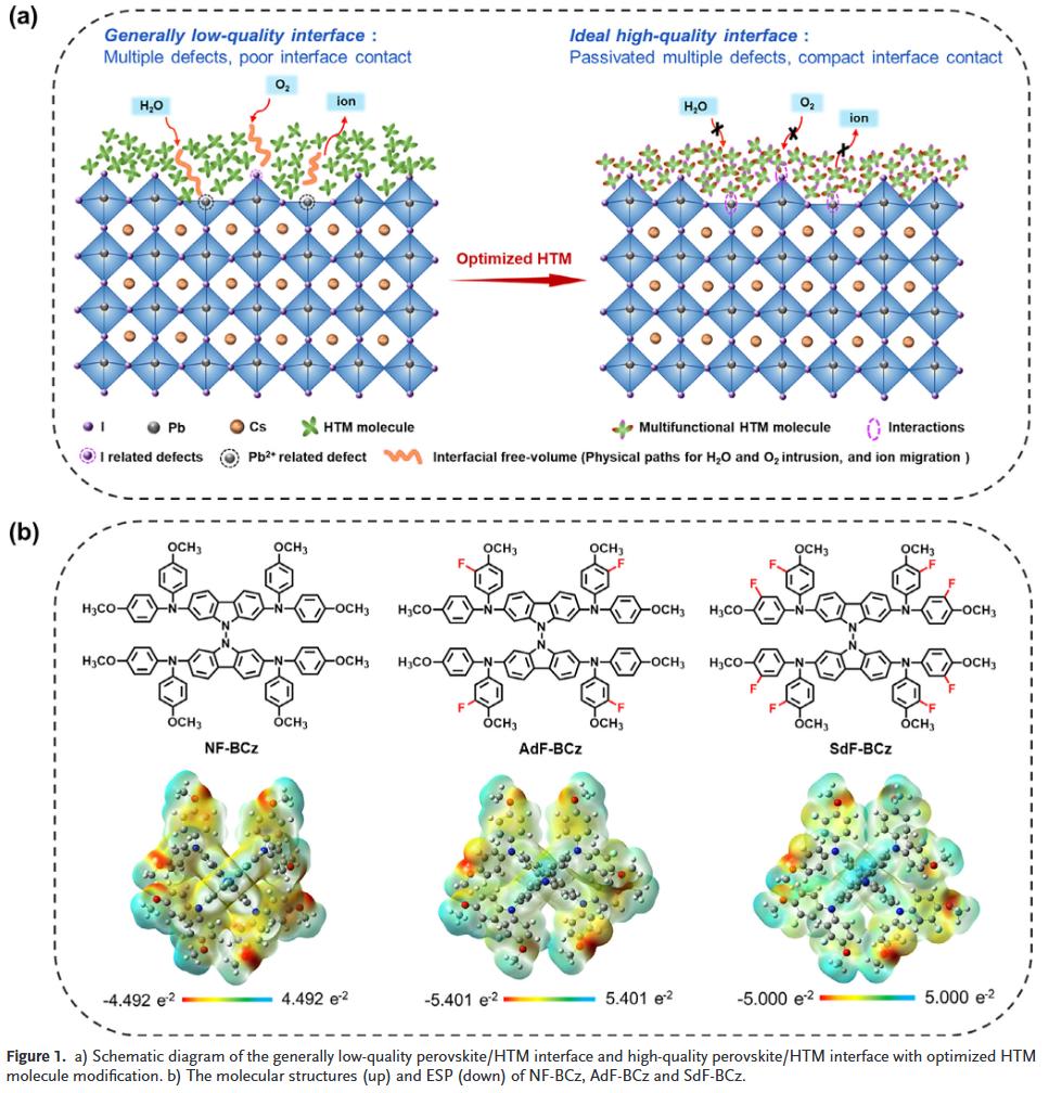 钙钛矿层与空穴传输材料(HTM)之间的界面缺陷和自由体积对钙钛矿太阳能电池(PSCs)的效率和稳定性具有关键影响。