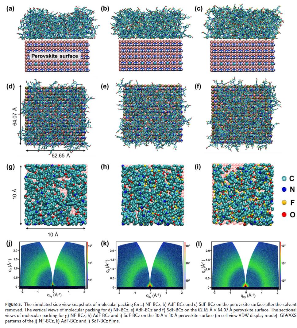 本研究太原理工大学郭鹍鹏、中国科学院金属研究所邱建航和陕西师范大学刘治科等人通过策略性地调控基于 N,N′-双咔唑(BCz)的HTM中氟原子的分布,分别在其外围基团上不对称和对称引入氟原子,合成了AdF-BCz和SdF-BCz两种材料。结合实验表征和原子分子动力学模拟,发现AdF-BCz相较于无氟的NF-BCz和对称氟化的SdF-BCz,表现出更优异的界面钝化稳定性(针对Pb²⁺和I⁻相关缺陷),以及与钙钛矿表面更强的粘附力。此外,AdF-BCz还能减少界面自由体积,促进更紧密的界面接触,有效抑制离子迁移和钙钛矿降解。