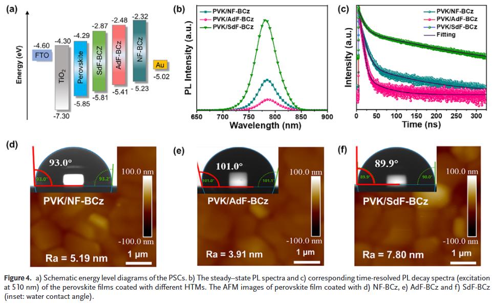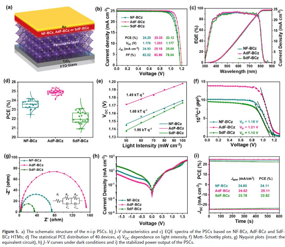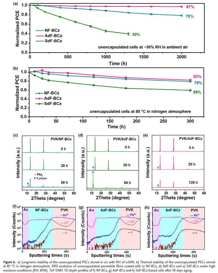 基于AdF-BCz的PSCs实现了25.35%的光电转换效率(PCE),优于SdF-BCz(23.12%)和NF-BCz(24.20%)的器件。未封装的AdF-BCz器件在30%相对湿度下2000小时后仍保持97%的初始效率,在85°C加热300小时后保持82%。