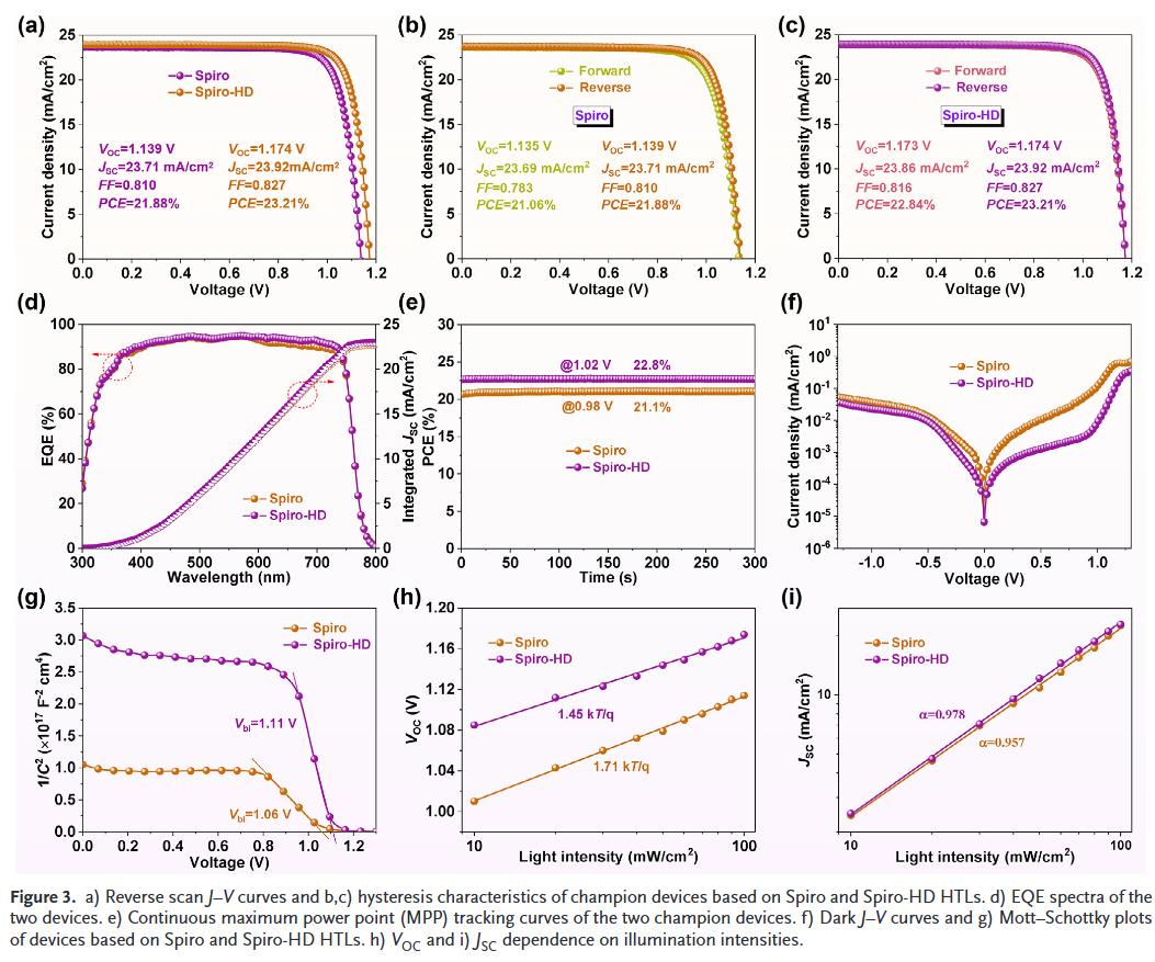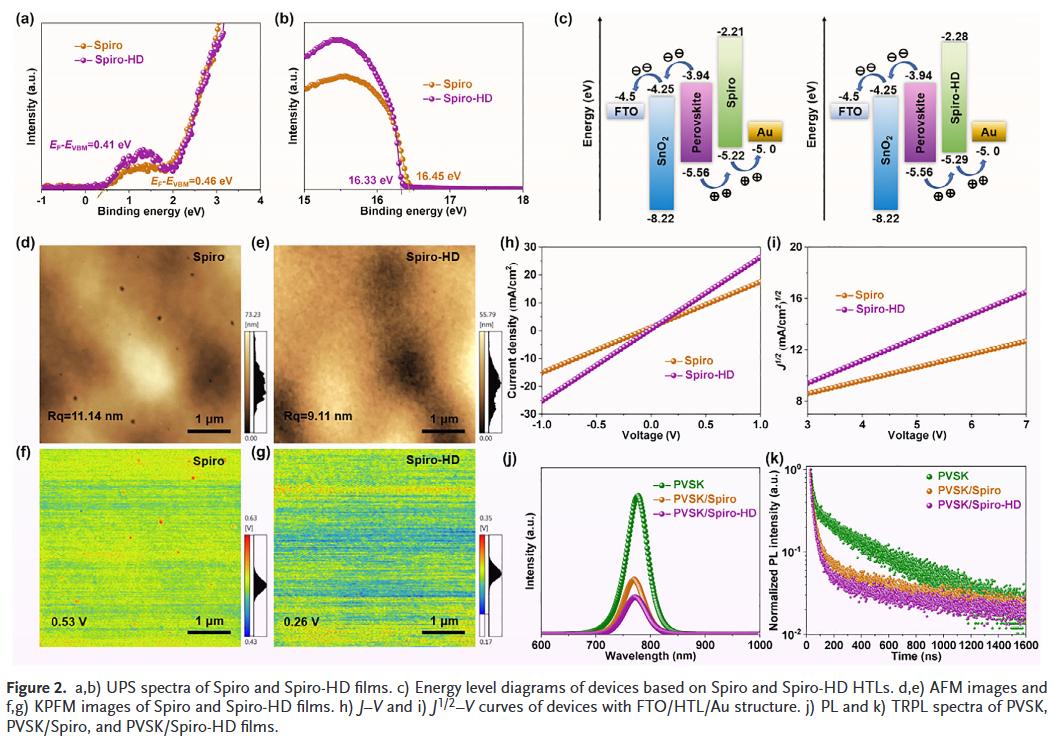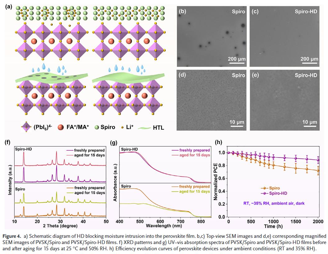 - 能级优化与界面增强:HD降低Spiro-OMeTAD的价带顶,优化与钙钛矿的能级对齐,同时提升HTL致密性和界面接触,减少非辐射复合,提高开路电压和填充因子。