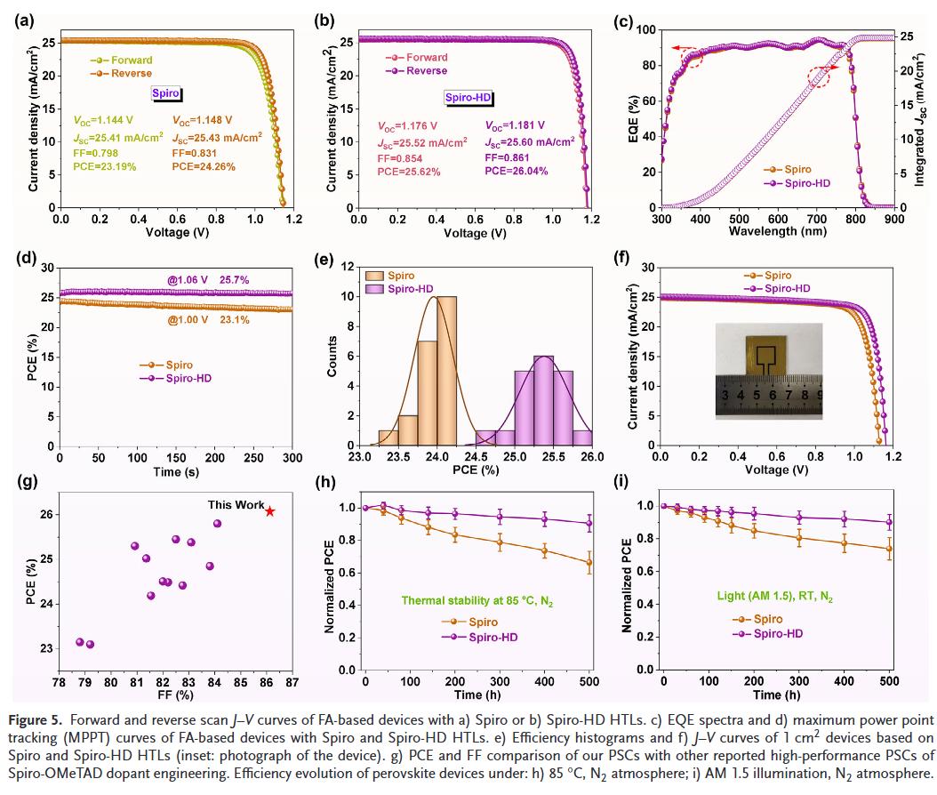- 高效与高稳定性兼得:CsFAMA和FA基器件效率分别达23.21%和26.04%,未封装器件在低湿(2500小时保持92%)、高温(85°C下500小时保持90%)和光照条件下均表现优异,突破Spiro-OMeTAD基器件性能瓶颈。