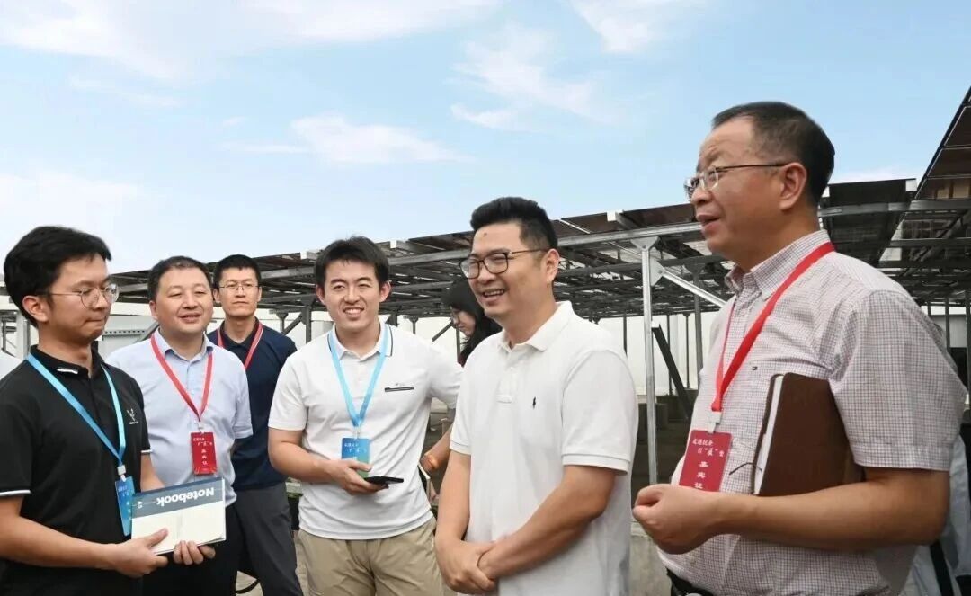 随后,统战部考察团移步办公楼顶,实地察看了用钙钛矿组件打造的屋顶电站。该电站装机容量达403.9kW,用定制的钙钛矿组件拼接出纤纳标识,不仅具备高效的发电能力,还通过独特的设计语言传递了企业的绿色理念。钙钛矿光伏板由支架撑起,下方的空间可以用来种植蔬菜,实现农光互补。