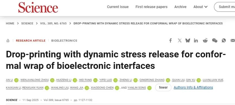 今日,中科院化学所宋延林研究员、李会增副研究员、新加坡南洋理工大学陈晓东教授和首都医科大学贾旺教授共同提出了一种全新的“液滴打印(drop-printing)”策略。研究人员利用液滴作为润滑与转移介质,实现了在各种复杂曲面上的无损薄膜转印。液滴在薄膜与目标表面间形成的流体层,不仅带来毛细力辅助的紧密贴合,还通过“滑移”机制有效释放应力,避免薄膜在变形过程中拉裂。该方法甚至能让厚度仅两微米的硅膜顺利贴合神经和脑组织,构建高精度神经电子接口,并成功实现光控在体神经调控。相关成果以“Drop-printing with dynamic stress release for conformal wrap of bioelectronic interfaces”为题发表在《Science》上,第一作者为An Li,Wenjianlong Zhou,李会增副研究员,Wei Fang和Yifei Luo为共同一作。