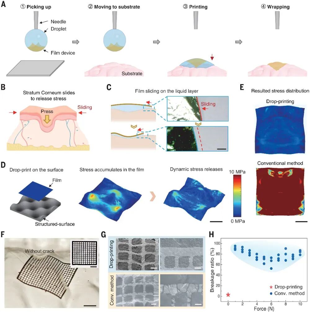 在实验中,研究团队详细展示了液滴打印的动态释压机制(图1)。与传统的“软印章”转移方式相比,液滴打印过程中,液滴渗入目标表面的微结构,形成一层润滑液膜。当薄膜发生二维到三维的形变时,应力通过液层“滑移”被快速释放(图1c、图1d),避免了灾难性的集中拉伸(图1e)。这一效果在对极脆弱的150纳米金膜转印时尤为明显:液滴打印能够让图案完整保留,而传统方法则常导致严重断裂(图1f、图1g)。更重要的是,这一策略几乎不施加外部压力,仅依靠液滴瞬时的轻微冲击力即可完成转印(图1h),真正实现了对薄膜的“温柔”包裹。