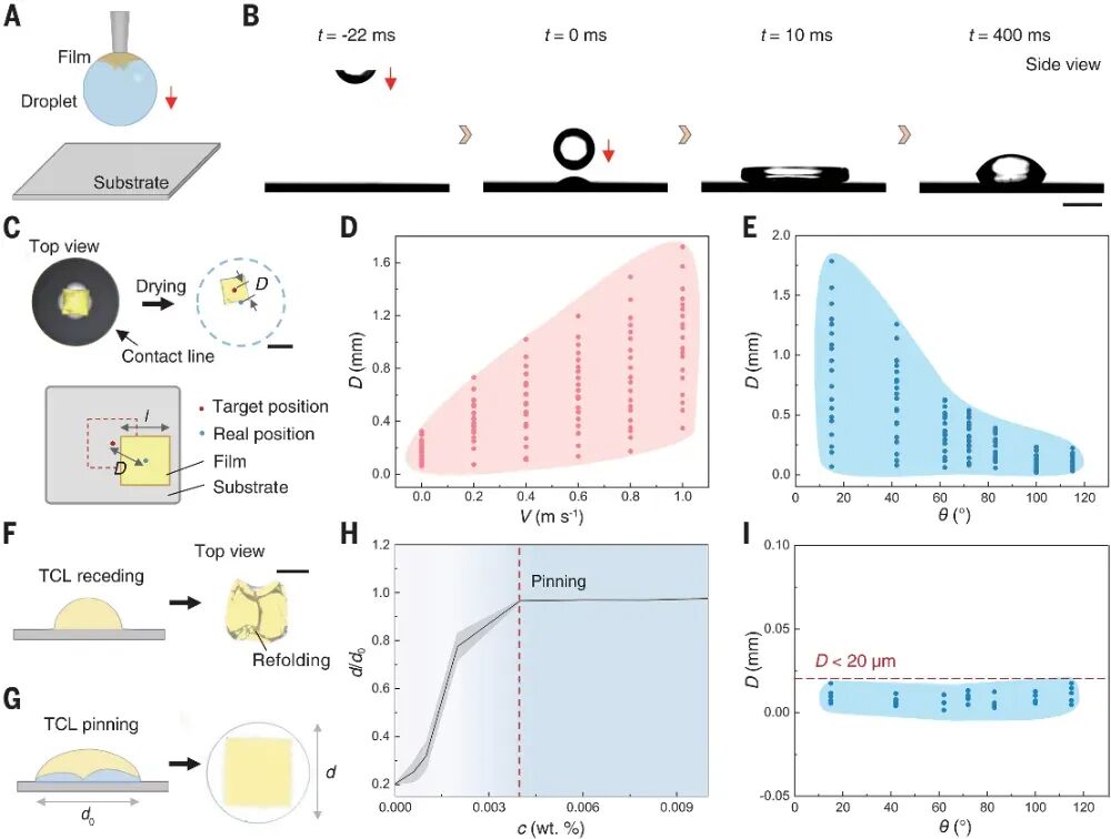 为了进一步提升位置精度,研究人员深入解析了液滴在打印过程中的三相接触线(TCL)调控机制(图2a、图2b)。实验发现,液滴蒸发过程中内部流动会导致薄膜产生随机偏移(图2c),影响定位精度。通过理论建模与数值模拟,团队揭示了液滴接触角、撞击速度与尺寸对TCL大小的决定作用(图2d、图2e)。随后,他们提出通过在液滴中引入明胶等少量添加剂,使接触线“钉扎”在目标表面(图2f、图2g),避免了回缩导致的薄膜折叠。得益于这一改进,液滴打印实现了小于20微米的定位精度(图2h、图2i),大幅优于现有转印方法。