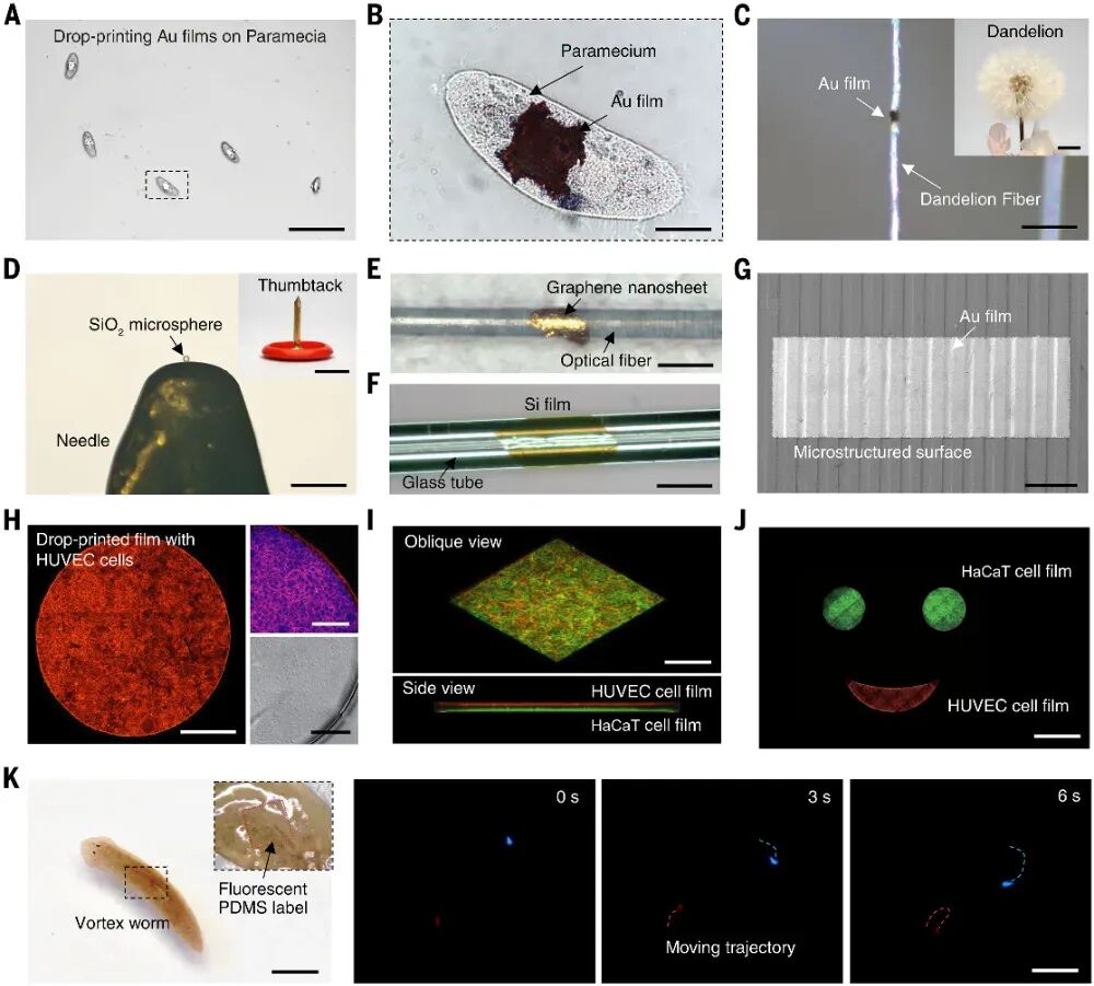 液滴打印的通用性同样令人印象深刻。团队展示了它在多种复杂体系中的适用性:从对极其敏感的草履虫表面包覆金膜(图3a、图3b),到在蒲公英纤维、二氧化硅微球、光纤及超薄硅膜上实现无损转印(图3c-图3f),甚至能在具有凹凸和回勾结构的基底上稳定成膜(图3g)。进一步,通过在液滴中调节成分,还能完成细胞薄膜的堆叠与精确图案化(图3h-图3j),甚至为生物体提供稳定的荧光标记与跟踪(图3k)。这一系列演示表明,液滴打印不仅能处理脆弱的无机薄膜,也能适配活体组织与功能材料,为未来的生物电子与智能器件设计提供了灵活平台。