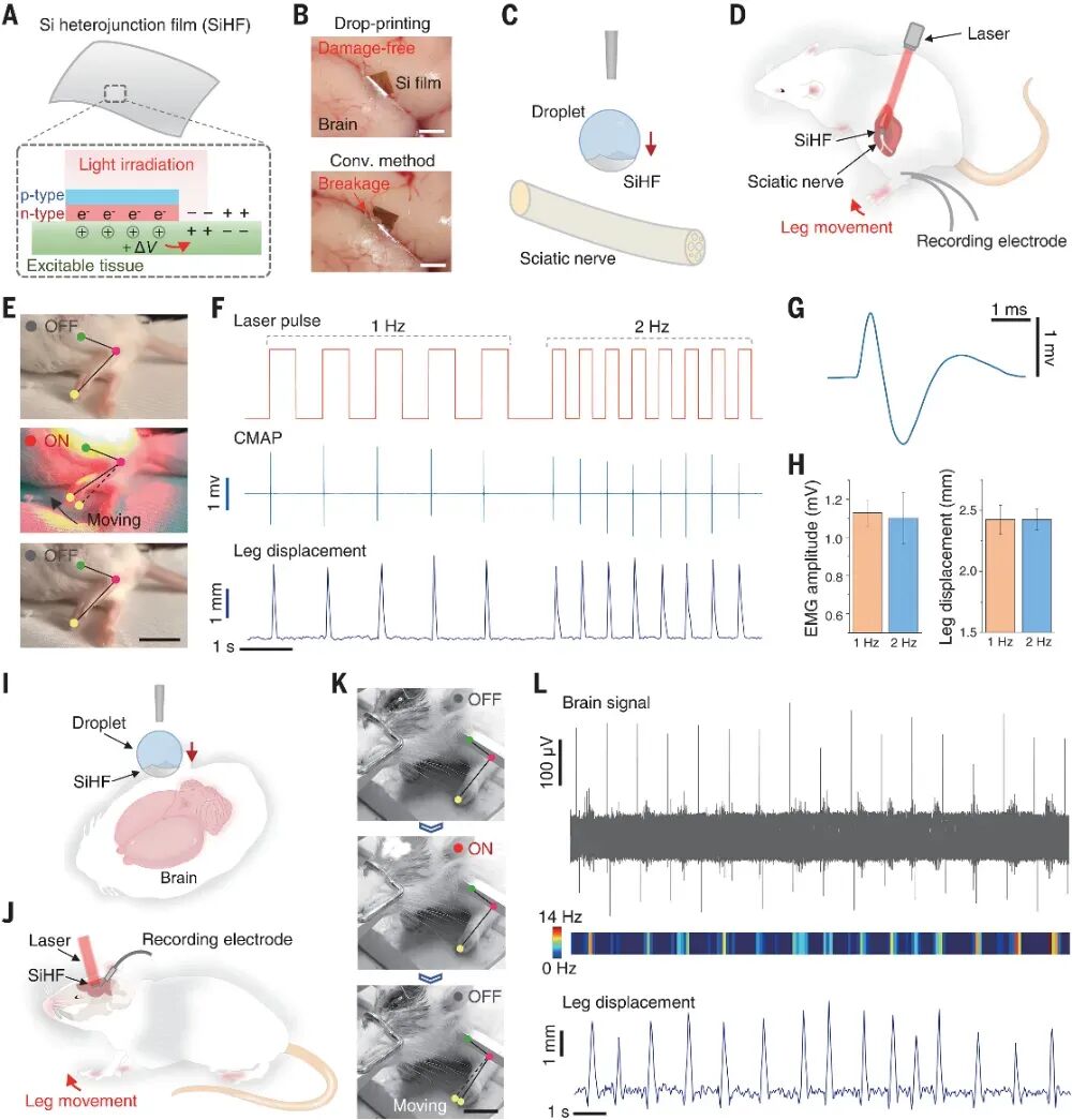 更具突破性的是,液滴打印在神经调控上的应用(图4)。研究人员将硅异质结薄膜通过液滴打印方式转印到猪脑表面,与传统方法下脆弱硅膜断裂不同,该方法实现了完整且精准的贴合(图4b)。在小鼠坐骨神经实验中,液滴打印的硅薄膜在近红外激光照射下成功诱发神经兴奋,实时驱动小鼠后肢运动(图4c-图4f)。同步的肌电信号与肢体动作表明,液滴打印接口能够高效传导光控刺激(图4g、图4h)。进一步,在大鼠大脑皮层实验中,液滴打印的神经电子接口同样实现了前肢运动的精确调控(图4i-图4l)。这一成果不仅验证了液滴打印在在体应用中的可行性,也为未来非侵入式神经调控技术提供了新范式。